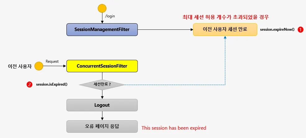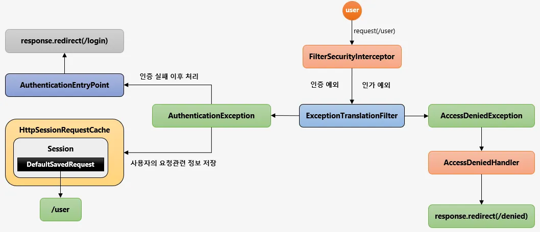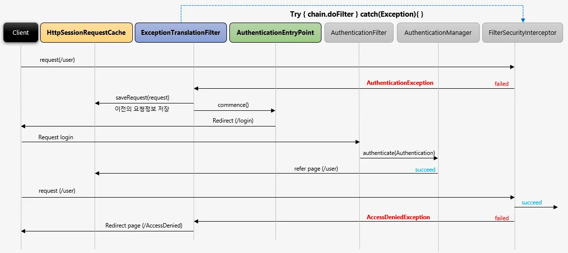 SpringSecurity가 관리하는 보안 필터중 마지막 필터가 FilterSecurityInterceptor이고, 바로 전 필터가 ExceptionTranslationFilter이고 해당 필터에서 사용자의 요청을 받을 때, 그 다음 필터로 그 요청을 전달할 때 try-catch로 감싸서 FilterSecurityInterceptor 를 호출하고 있고, 해당 필터에서 생기는 인증및 인가 예외는