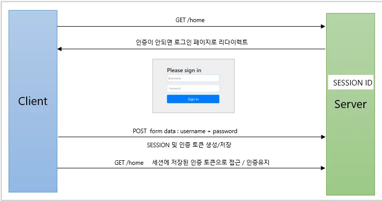 Client에서 /home 접근요청 시 세션에 저장된 인증 토큰으로 접근및 인증 유지