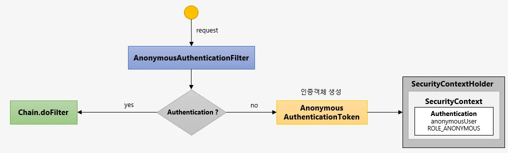 → 정확히는 인가 예외를 던진다. 왜냐하면 해당 사용자는 익명(anonymouse)사용자이기에 인증을 받지 않은 상태라서 인가 예외(AccessDeniedException)로 빠진다.
