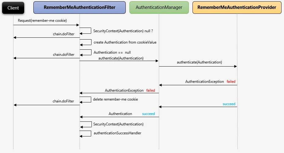 인증관리자(AuthenticationManager)는 내부적으로 AuthenticationProvider 에게 인증처리를 위임하게 된다. 해당 Provider가 인증처리를 담당하는 클래스로써 인증에 성공/실패를 반환하는데 실패할 경우 AuthenticationException 예외를 반환하여 UsernamePasswordAuthenticationFilter로 돌아가서 예외처리를 수행하고, 인증에 성공하게 되면, Authentication 객체를 생성하여