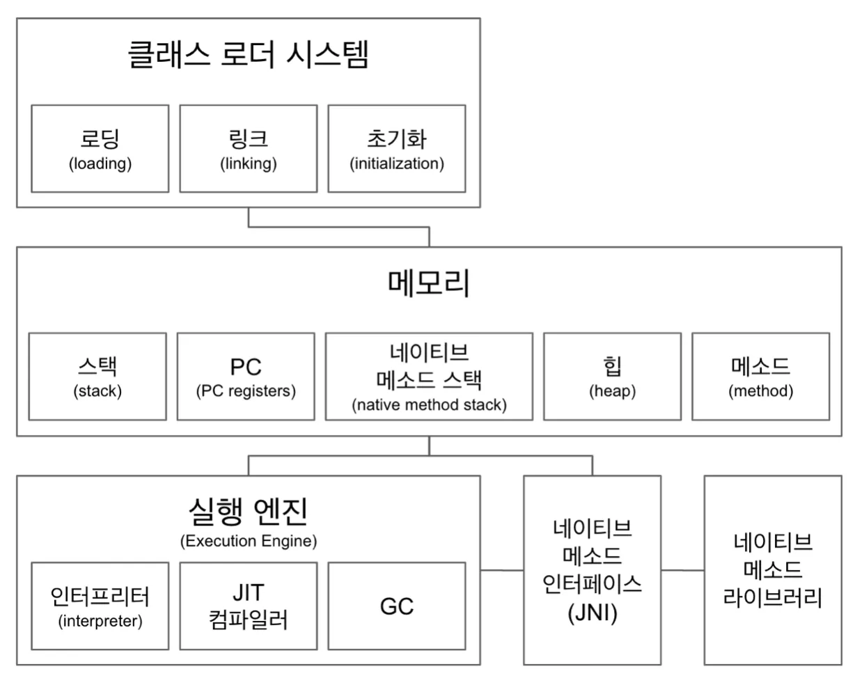 자바 가상 머신으로 자바 바이트코드(.class 파일)를 OS에 특화된 코드로 변환(인터프리터와 JIT 컴파일러)하여 실행한다.