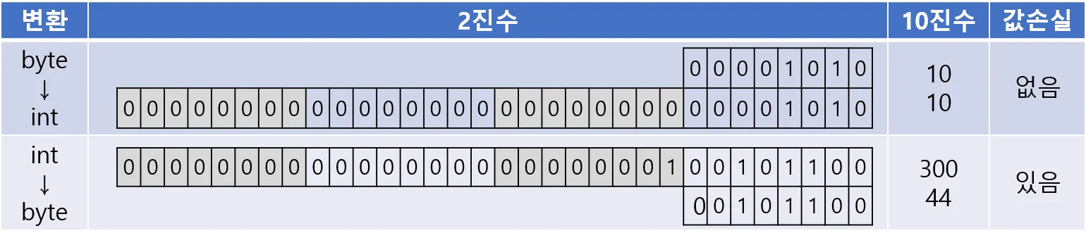 ⇒ int형을 byte형으로 변환하는경우 하위 8자리(1byte)만 보존하기에 그외에 값이 손실된다.