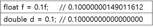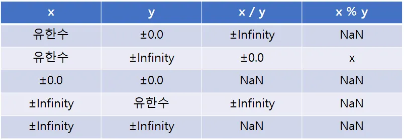 0이 아닌 부동 소숫점값(0.0f, 0.0d)를 사용하는것은 가능하지만 이 경우엔 무한대(Infinity)가 반환된다.