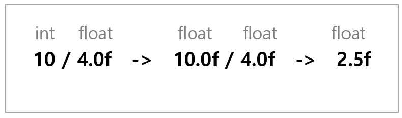 위의 연산과정을 보면 두 피연산자의 타입이 각각 int형과 float형으로 일치하지 않기에 타입을 맞춰줘야하는데, 보통 범위가 넓은 쪽으로 매치가 되기에 int보다 범위가 넓은 float타입으로 일치시킨 뒤 연산을 수행한다.
