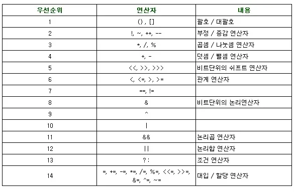 항은 단항 > 이항 > 삼항의 순서입니다.  연산자들의 진행방향은 좌측에서 우측으로 진행되며 단항 연산자와 대입 연산자의 경우에는 우측에서 좌측으로 진행됩니다.
