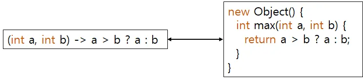 자바에서 모든 메서드는 클래스내에 포함되어야 하는데, 람다식은 어떤 클래스에 포함되어 있는 것일까? 람다식은 사실 익명 클래스의 객체와 동등하다.