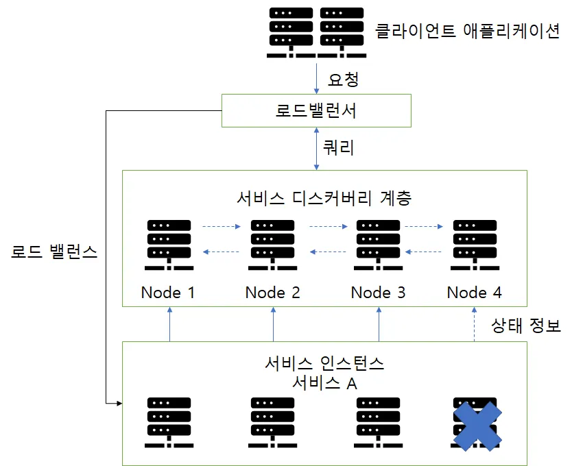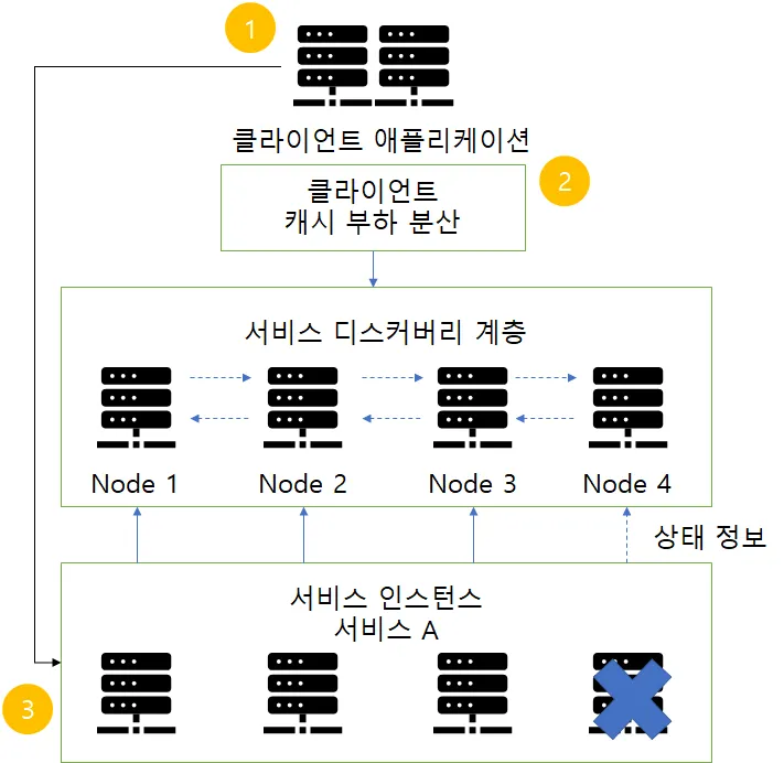 : 서비스 디스커버리 클러스터의 각 노드는 서비스 인스턴스 상태를 공유한다.
