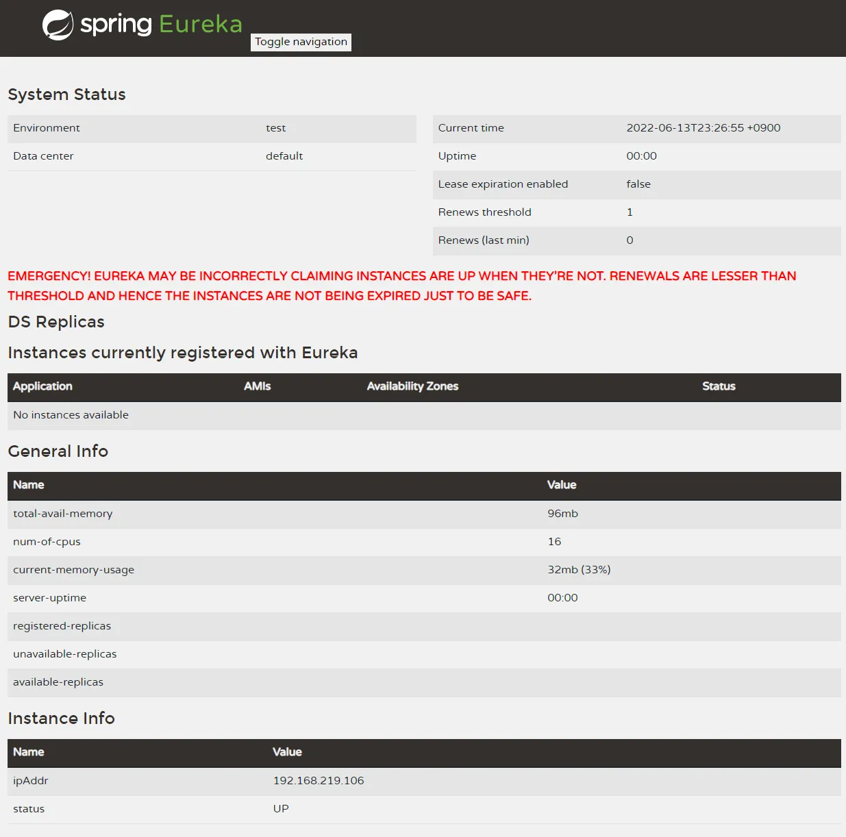 아직 등록된 서비스 애플리케이션이 없어서 인스턴스가 보이지 않는다.