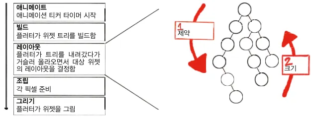 여기서 조립 과정을 진행하며 플러터는 위젯에 실제 화면상의 좌표를 제공하며 위젯은 자신이 차지할 실제 픽셀의 수를 알게 된다.