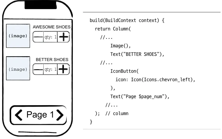 위젯은 상태를 가진다. 위 그림에서 BETTER SHOES버튼은 qty라는 상태를 가지며 위젯의 플러스(+) 혹은 마이너스(-) 버튼을 누르면 내부 상태가 바뀌며 이 상태에 의존하는 모든 위젯을 갱신한다.
