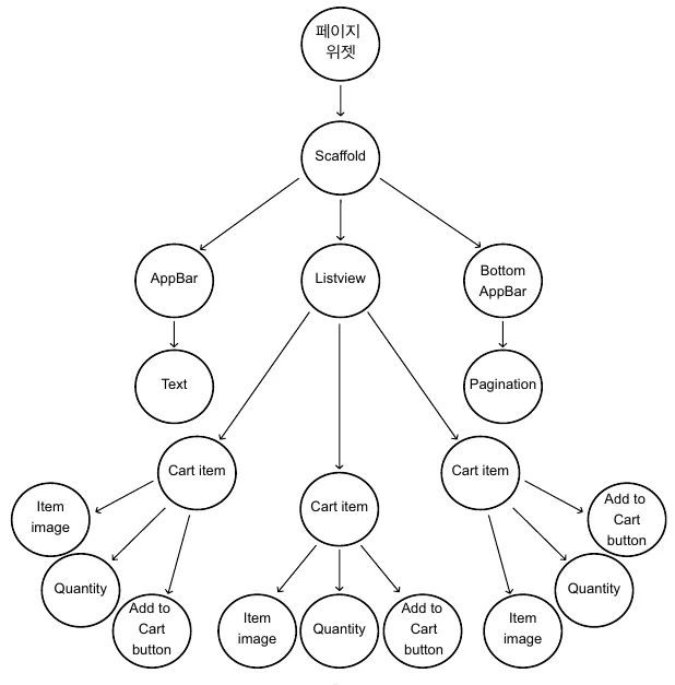 장바구니 위젯 트리. 실제로는 훨씬 많은 위젯을 포함한다.