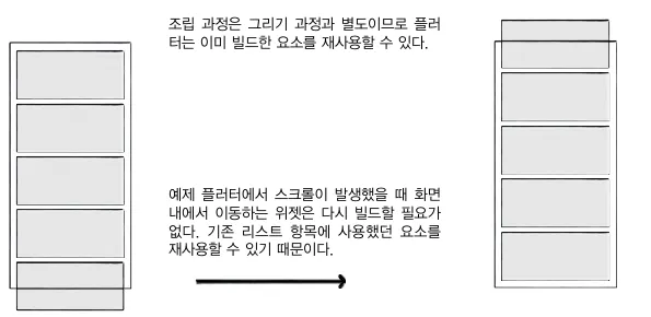 이 과정은 의도적으로 분리해 진행되는데, 그 덕에 조립된 위젯을 재사용할 수 있다.