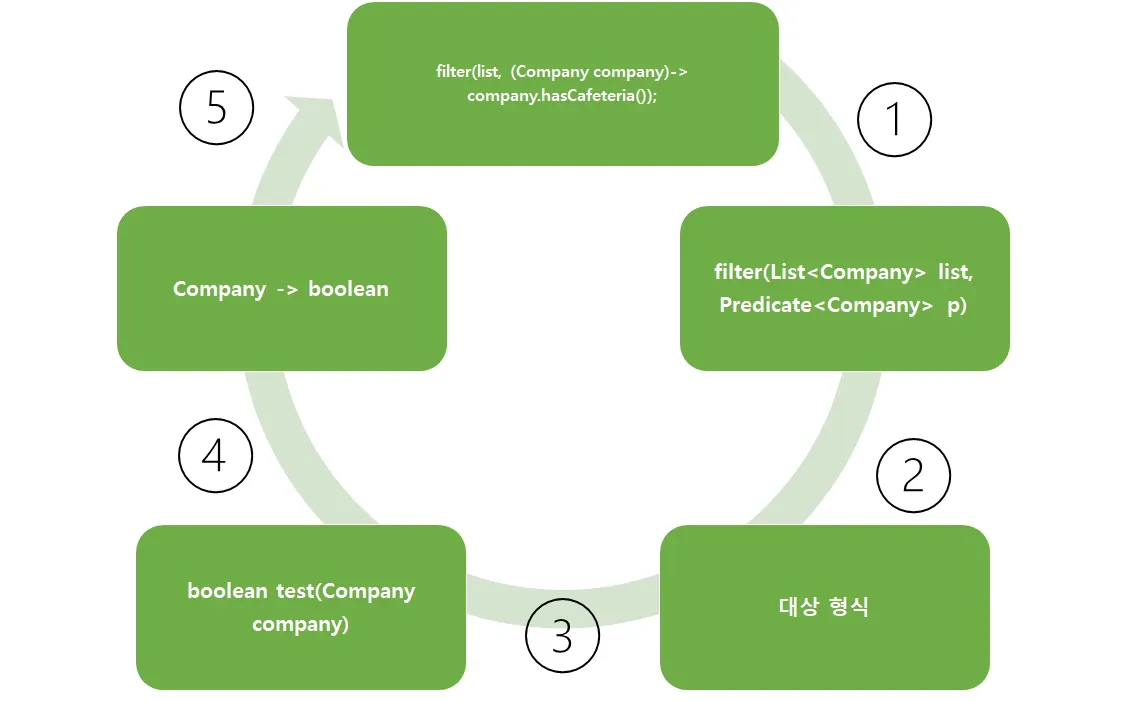 Prediate<Company> p는 boolean test(T t) 라는 하나의 추상 메서드를 정의하는 함수형 인터페이스이다.