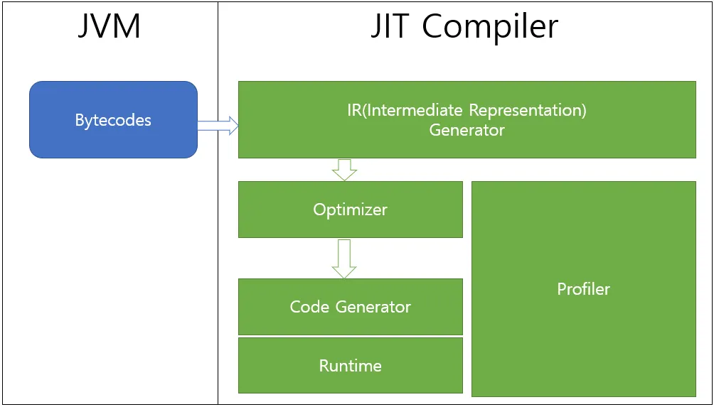 JIT 컴파일러는 바이트코드를 우선 중간 단계의 표현인 IR(Intermediate Representation)로 변환하여 최적화를 수행하고 그 다음 네이티브 코드를 생성한다.