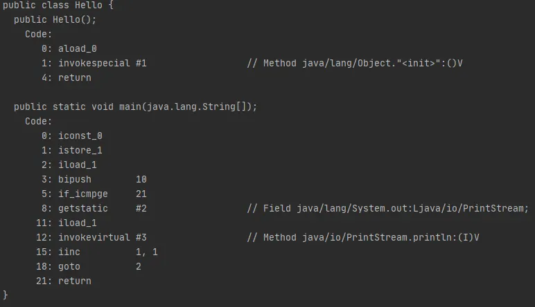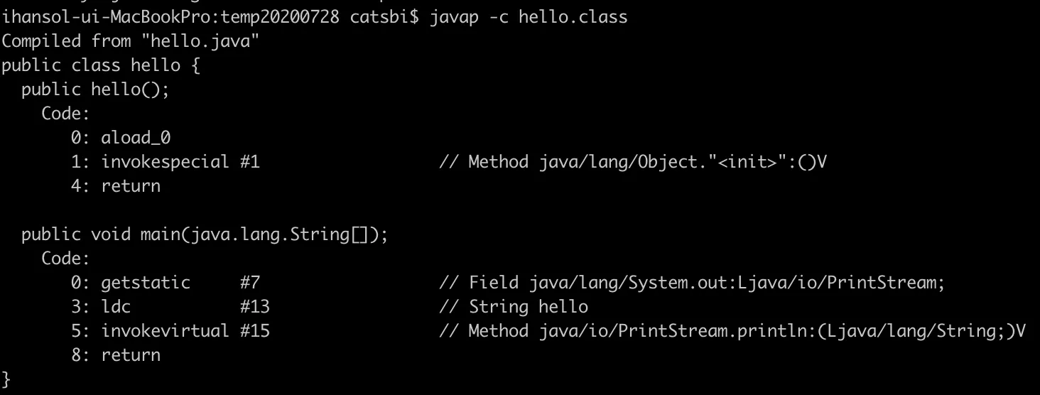 위 자바 코드를 자바 컴파일러를 통해 아래와 같은 바이트코드로 번역한다.