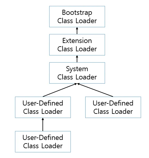 계층 구조: 클래스 로더끼리 부모-자식 관계를 이뤄 계층 구조로 생성된다. 여기서 최상위 클래스 로더는 부트스트랩 클래스 로더(Bootstrap Class Loader)이다.