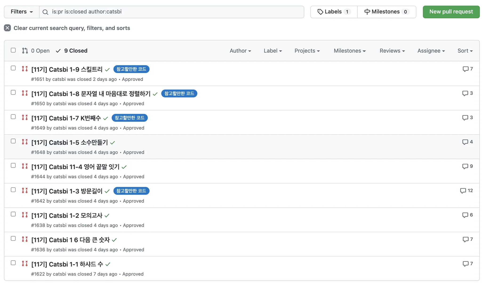 그래서 첫 날을 제외하고는 하루에 3~4문제씩 풀면서 제출하고 Request Change 되면 바로 동시에 리팩토링을 진행하면서 Pull Request를 했다. 그 덕에 1주차 미션을 목요일~금요일쯤 모두 Resolve 할 수 있었고, 참고할만한 코드라는 라벨도 얻을 수 있었다. 현재는 내 PR에만 붙어있다는 점이 자랑아닌 자랑이다.