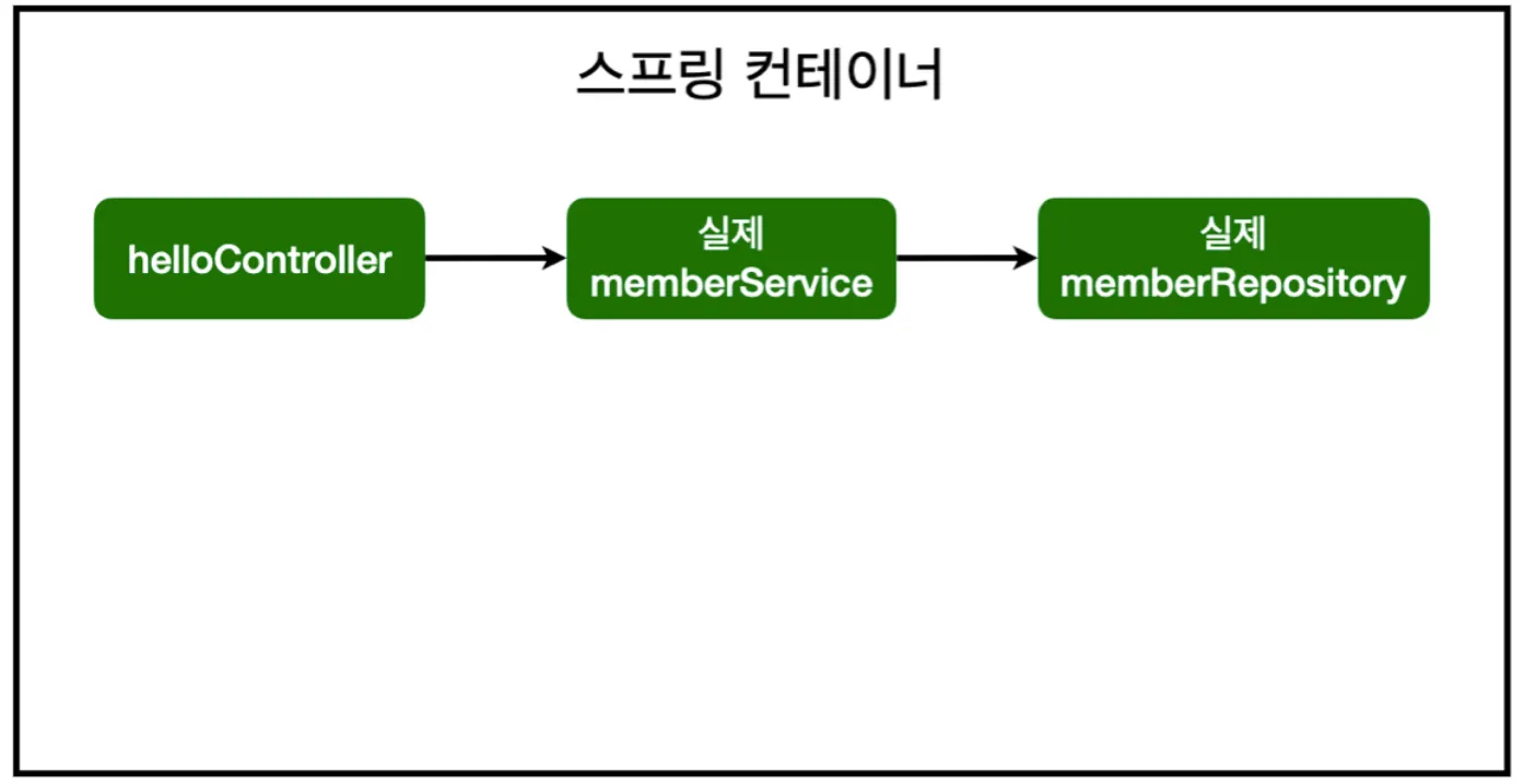 helloController 가 memberService 에 메서드를 호출해 비즈니스 로직을 수행하고 memberService에서는 memberRepository 를 호출하여 레파지토리에서는 DB에 접근해 데이터를 조회/수정/삭제 합니다.